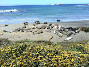 Nach dem Stop ging's weiter die Küste entlang. Kurz vor San Simeon hielten wir nochmals an um eine Kolonie Seelkühe + Seeelephanten zu beobachten. Tonnenschwere Tiere dösten hier am Strand und wärmten sich in der Sonne.